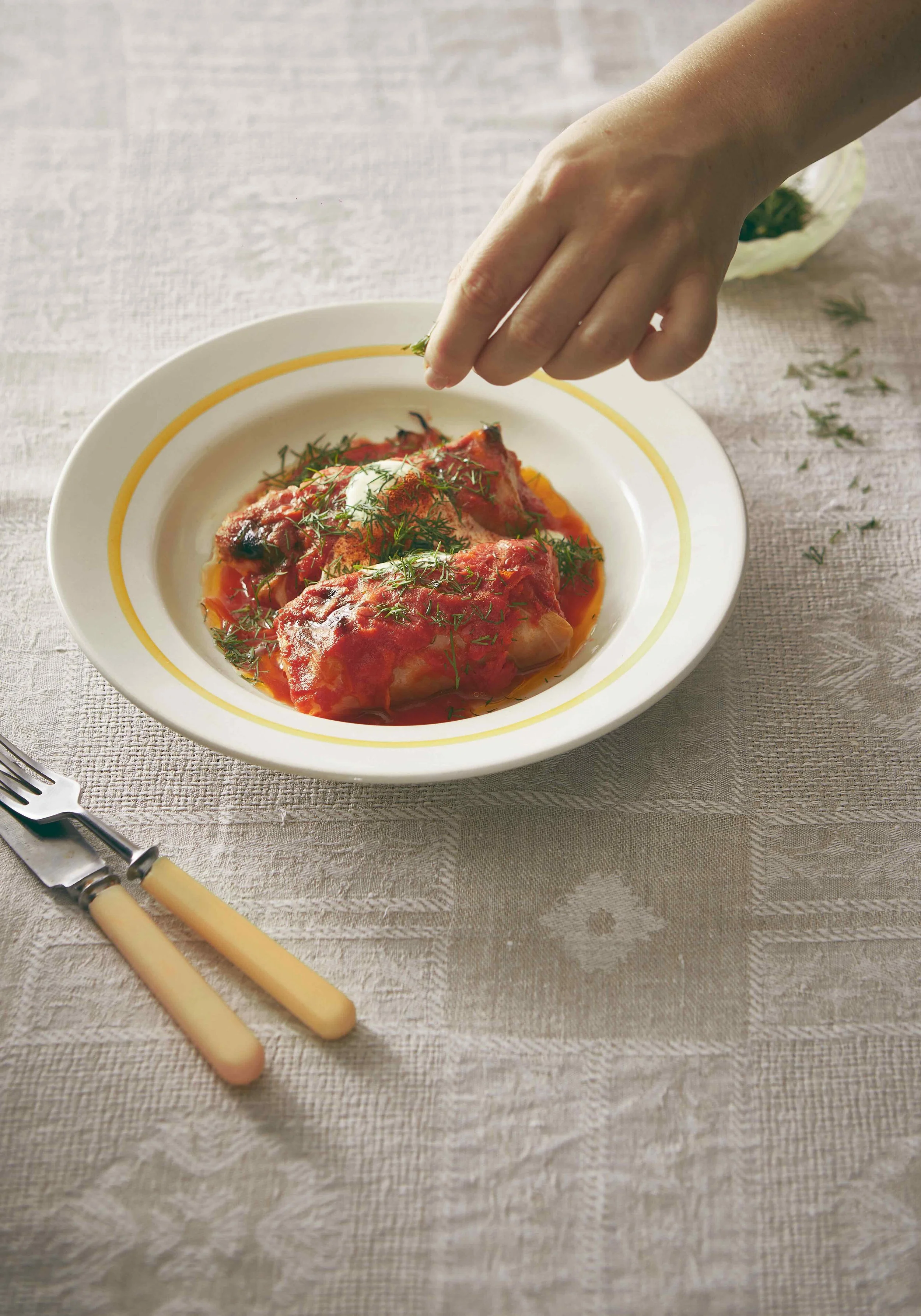“I love to serve whole burnt aubergines in this way, where the punchy sauce is spooned over them, covering them generously like sauce blankets. This is quite a substantial vegetarian main so I would serve it with something light, like the Herby Leafy Salad.” – Noor Murad